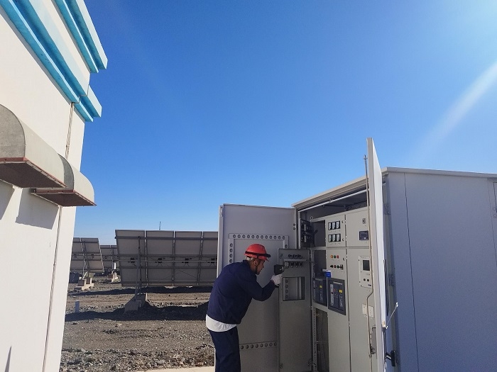 △吐魯番聯(lián)星光伏電站運維人員開展部分設(shè)備雙電源接入工作,汗水浸透后背